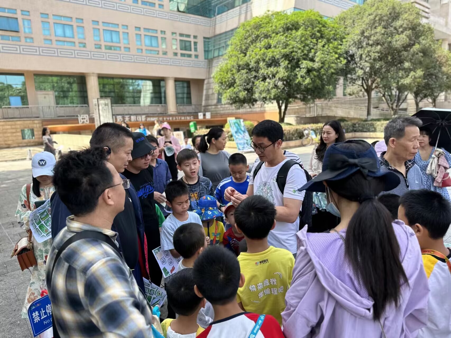 最后,进入自然观察打卡环节。家长和孩子们根据指定的路线,按顺序到校园内的八个打卡点进行打卡,每个打卡点设有讲解员,家长和孩子们通过倾听讲解员的讲解以及对相关植物进行观察感受后,可使用手机扫描任务卡上的二维码进行答题,答题通过后讲解员给予打卡贴纸,完成所有打卡点打卡任务后即可在劝学岛领取奖品一份。