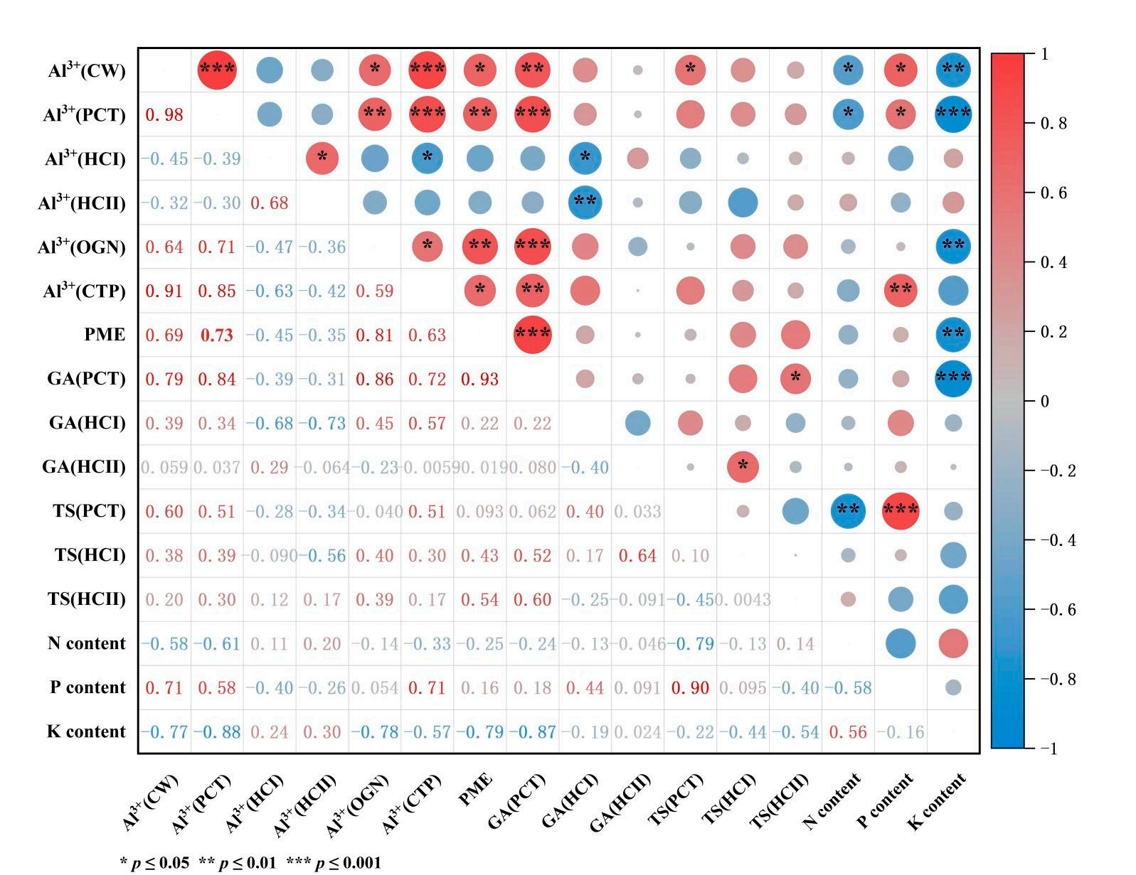 注:图中方块里的数字1表示完全正相关,-1表示完全负相关,0表示无相关性。CW(细胞壁),PCT(果胶),OGN(细胞器),CTP(细胞质),TS(总糖含量)。