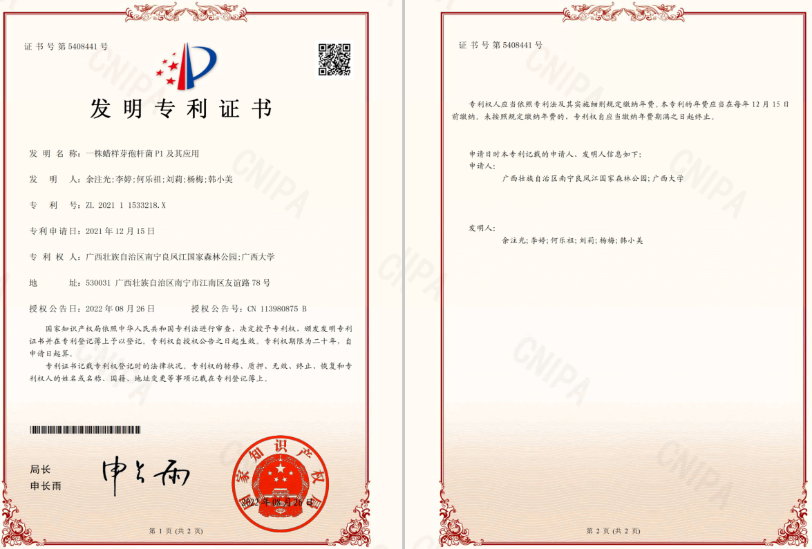 基于上述从望天树根际环境中筛选得到的优良菌株,伟德体育杨梅教授团队和南宁树木园合作,两家合作单位分别通过1株高效溶磷菌株(P8和P1),成功申请了国家发明专利5项。其中2项专利分别可提供1种唐菖蒲伯克霍尔德菌(Burkholderia gladioli)P8和1种蜡样芽胞杆菌(Bacillus cereus)P1,均可用于将土壤中难溶性的磷转化为可以被植物吸收的有效磷。这2个菌株现均保藏于中国微生物菌种保藏中心管理委员会普通微生物中心(简称CGMCC),保藏登记号分别为CGMCC No.22825和CGMCC No.22821。获得的发明专利其一名称为《一株唐菖蒲伯克霍尔德氏菌P8及其应用》,发明人为“杨梅,韩小美,余注光,黄平升,李万年,汪丛啸,廖思”,专利号为ZL 2021 1 1531315.5。发明专利其二名称为《一株蜡样芽孢杆菌P1及其应用》,发明人为“余注光,李婷,何乐祖,刘莉,杨梅,韩小美”,专利号为ZL 2021 1 1533218.X。