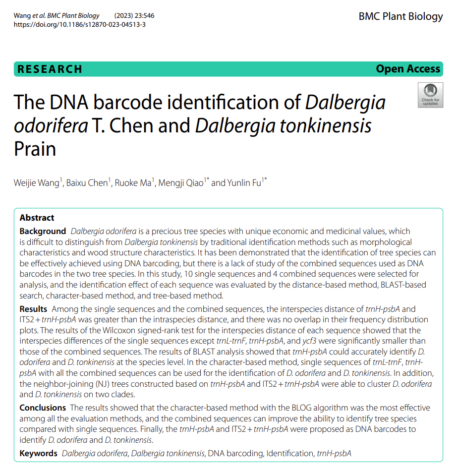近日,伟德体育符韵林教授团队在木材的DNA条形码鉴定方面的研究成果《The DNA barcode identification of Dalbergia odoriferaT. Chenand Dalbergia tonkinensisPrain》(降香黄檀与东京黄檀的DNA条形码鉴定),发表于生物学领域期刊BMCPlant Biology(伟德体育二区,IF=5.3)。公司生态学博士研究生王巍洁为论文的第一作者,乔梦吉讲师和符韵林教授为通讯作者。该研究得到了国家自然科学基金(31870540)的支持。
