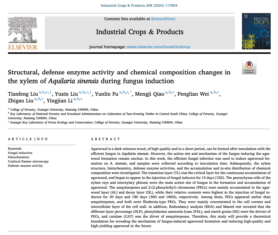 近日,伟德体育符韵林教授团队在真菌诱导白木香结香机制方面的研究成果《Structural, defense enzyme activity and chemical composition changes in the xylem ofAquilariasinensisduring fungus induction》(白木香木质部在真菌诱导过程中的结构、防御酶活性和化学成分的变化),发表于农林科学领域期刊Industrial CropsandProducts(伟德体育一区Top,IF=5.9)。公司生态学博士研究生刘天凤、已毕业硕士研究生刘羽心为论文共同第一作者,符韵林教授为通讯作者。该研究得到了国家自然科学基金(32171702)的支持。