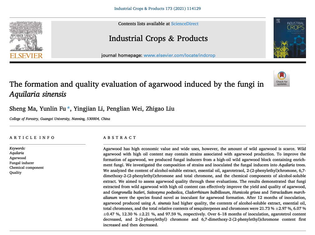 该研究是基于高效结香真菌能诱导白木香形成高品质沉香基础上而进行的深入探索。在此之前,符韵林教授团队新发现了Gongronellabutleri、Saitozymapodzolica、Cladorrhinumbulbillosum、Humicolagrisea和Tetracladiummarchalianum可作为诱导沉香形成的新菌种,它们侵染白木香诱导的沉香质量能与野生沉香相媲美,此项研究成果《The formation and quality evaluation of agarwood induced by the fungi inAquilaria sinensis》(真菌诱导白木香形成沉香及其质量评价)发表于农林科学领域期刊Industrial Crops and Products(伟德体育1区Top,IF=5.645)。而本研究揭示了沉香形成的作用部位和驱动因素,这为今后揭示优质高产的沉香形成的分子机制奠定基础。