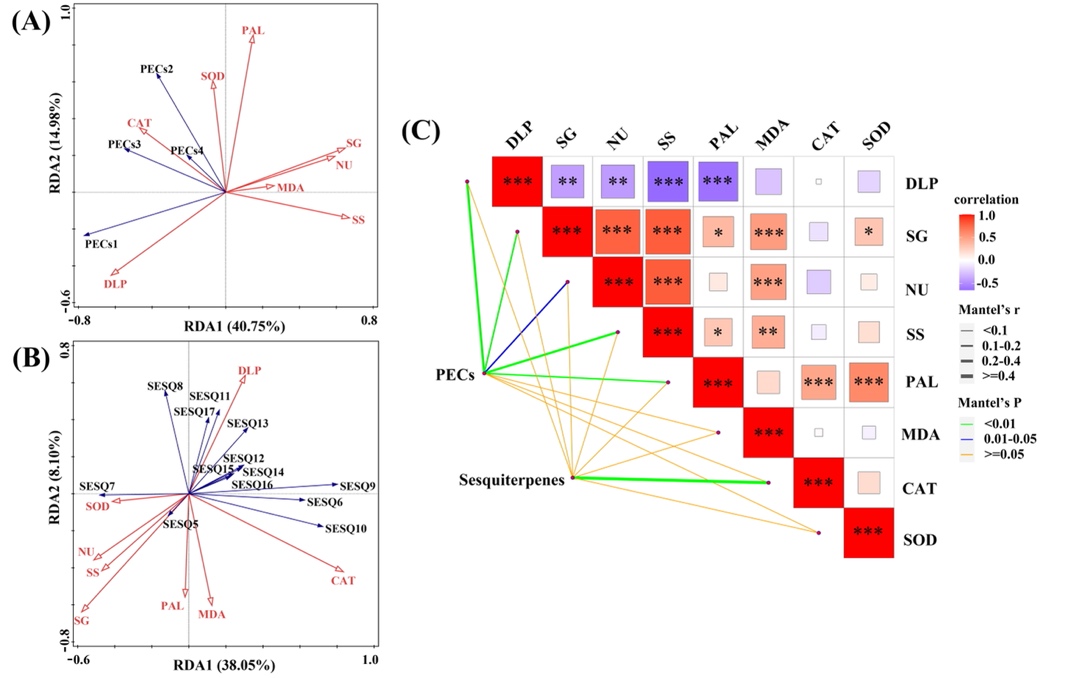 本研究采用高效结香真菌侵染白木香幼苗,研究了在此过程中木质部结构、组织化学、防御酶活性以及化学成分的积累和原位分布的变化。研究结果显示,随真菌接种时间的延长,在木质部形成了宏观可见的腐烂层(DL),沉香层(AL)过渡层(TL)和健康层(HL),AL的占比不断增加,其中TL是沉香持续积累的关键层。由HL至DL,木质部内具有生命活动的薄壁细胞活性下降甚至死亡。树木为保持持续的生命活动,淀粉粒和可溶性还原糖等营养物质发生改变。与此同时,防御反应启动,使TL和AL中PAL,CAT,SOD活性以及丙二醛含量均增加。此外,真菌首先存活并聚集于木射线和内含韧皮部薄壁细胞内,为阻止真菌菌丝在木质部的扩散,出现沉香树脂等内含物堵塞纹孔,挤压菌丝以抑制真菌在木质部内继续生长和扩散。因此,射线和内含韧皮部薄壁细胞是沉香积累的主要作用部位。倍半萜和2-(2-苯基乙基)色酮(PECs)作为沉香的特征成分主要在AL和DL中积累,集中分布于细胞壁的细胞角和细胞间层。最后,该研究提出不同层的百分比、PAL和淀粉粒是PECs的驱动因素,CAT是倍半萜的驱动因素。