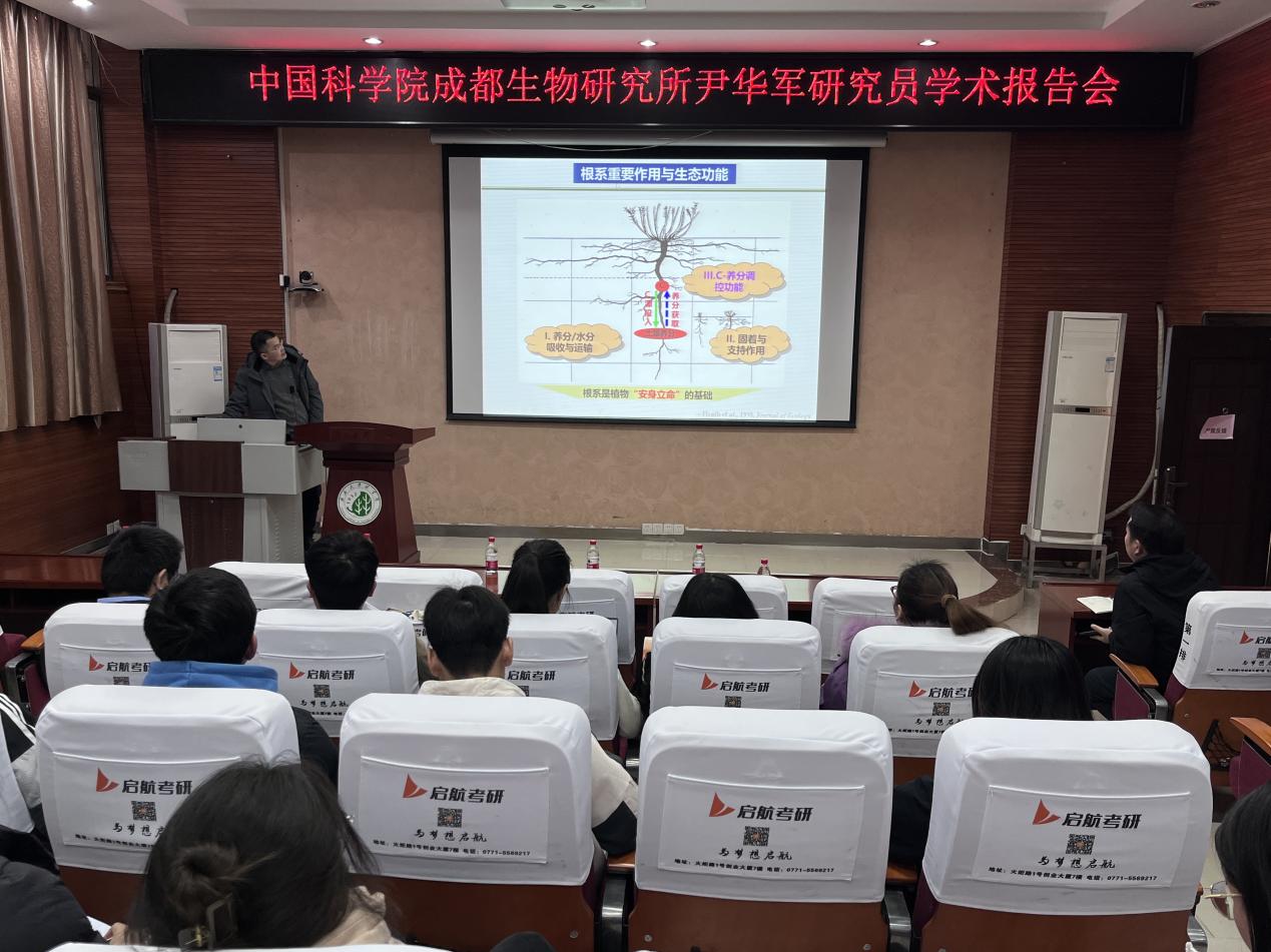 2023年12月24日至25日,伟德体育成都生物研究所尹华军研究员受邀到公司开展学术交流活动,并作了题为“高寒森林根际生态过程研究”的学术报告。本次学术报告会由公司副经理尤业明老师主持,公司相关教师、研究生和本科生共计100余人聆听了学术报告。