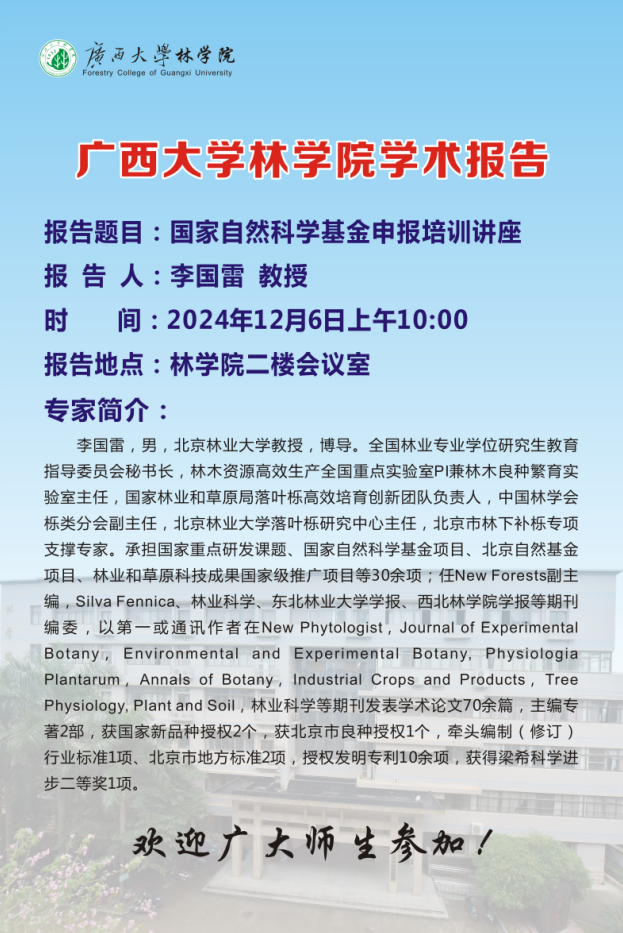 2024年12月6日上午,公司在二楼会议室举行《国家自然科学基金申报交流会》。本次活动邀请了北京林业大学伟德体育李国雷教授作为主讲嘉宾,座谈会由公司副经理杨梅教授主持。