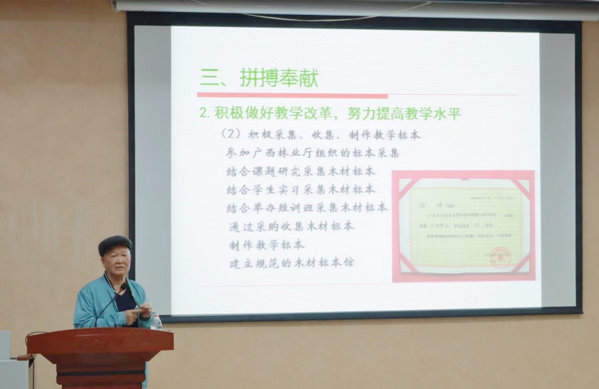 紧接着,被新闻媒体誉为“木材鉴定行业的福尔摩斯”的徐峰教授结合自己的亲身经历,饱含激情地从家风讲起,用自己的日常向同学们描述他朴素节俭的生活,提到对他影响很大的老师与亲友,他目光真挚,用简单的语言传达殷殷教诲,并告诉同学们他最为看重的品质就是“为人诚实”,告诫员工们:“诚实做人,认真做事才会有出息”。虽然徐峰老师已经退休多年,但作为现任Bevictor伟德教学督导团成员,仍积极为公司出力,为社会服务。讲到情深处,徐峰老师向师生们展示他所获得的荣誉奖牌,并讲述了这些奖牌背后蕴含的优秀事迹。最后,徐峰老师把“拼搏精神”送给大家,鼓励同学们积极参加进修学习,努力打牢理论基础。