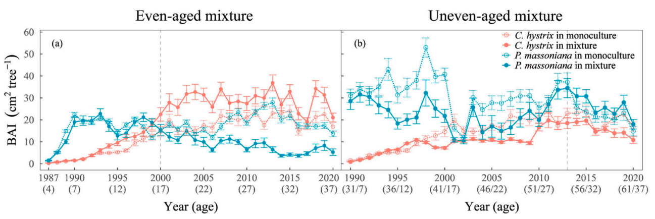 针对以上背景,该研究采用年轮学的方法,在个体水平(共286株树木)重建了马尾松(Pinus massoniana)和红锥(Castanopsis hystrix)组成的同龄混交林(EMs)和异龄混交林(UEMs)及其相应的纯林的37年生长序列。结果显示,在EMs中,马尾松的生长量较其纯林平均降低20.8%,而红锥则较纯林提高26.2%。然而,在混交的前17年内,马尾松的生长量并未受到显著影响,但在此之后则明显受到红锥的抑制。相较之下,在UEMs中,马尾松与红锥的生长量较其纯林均有所下降(分别降低20.8%和26.2%),但随着混交时间延长,马尾松在混交30年后由受抑制转为受促进。此外,UEMs中马尾松的相对生长量随旱季降水量增加而提升。