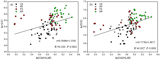 鉴于此,公司研究团队选取广西南宁市马山县典型石漠化山区经过长期植被恢复的降香黄檀纯林(PD)、顶果木纯林(PA)和降香黄檀/顶果木混交林(MP)三种林分作为研究对象,并以相邻的天然保留地作为对照(CK),重点探究固氮树种单一和混交种植对石漠化山区表层土壤团聚体有机磷(Po)积累和转化的影响。结果表明,在石漠化山区,引入固氮树种单一或两种树种混交种植,对表层土壤(0-10cm)团聚体的理化性质、Po组分和微生物群落结构以及功能产生不同程度影响,其中两种固氮树种混交种植更能显著提高表层土壤团聚体Po的积累和有效性。Po组分主要受ALP、MBN和AM真菌的影响,在石漠化山区引入固氮树种进行植被恢复主要通过影响SOC、NO3--N、C/P、Actinobacteria和AM真菌,最终影响土壤P的转化。该研究强调了利用固氮树种混交种植对于恢复严重退化的石漠化山区土壤的重要性,该策略可用于提高我国石漠化山区土壤团聚体Po的积累和转化,从而可能有效促进地上植被的恢复和稳定性植物群落的构建。