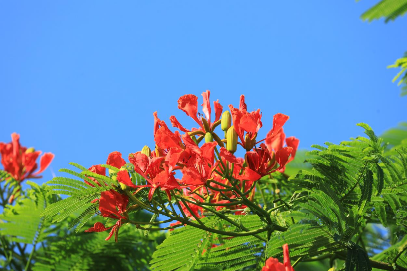 凤凰木是热情与活力的化身,在许多地方的节日庆典中,凤凰木盛开的景象总是与欢乐的氛围相得益彰。象征着青春的炽热与生命的蓬勃,激励人们珍惜时光,尽情释放生命的能量。在校园中,凤凰木也常成为毕业季的背景板,承载着学子们的青春记忆与对未来的憧憬。