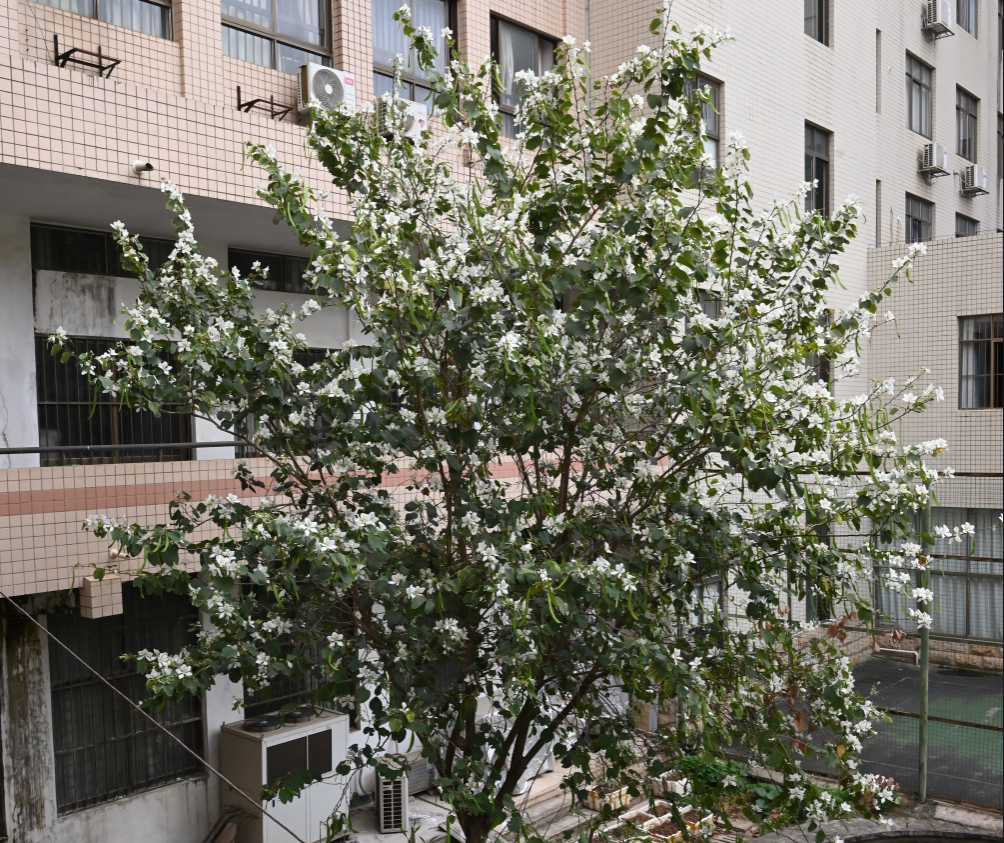 白花宫粉羊蹄甲以素洁的花姿点缀南国春色,花谢后结出长条形荚果,秋冬悬挂枝头,别具野趣。无论是孤植还是群栽,它都以独特的叶形与纯净的花色,成为春日里一道恬静的风景。